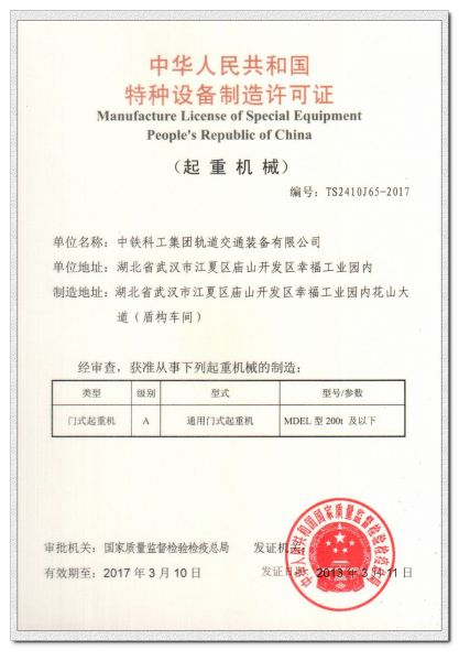 中华人民共和国特种设备制造许可证门式起重机A级